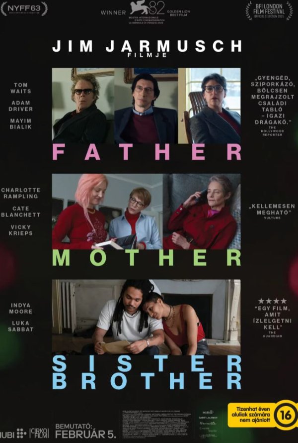 A „Father Mother Sister Brother” három epizódja egy-egy család történetét mutatja be. A testvérek mindhárom részben hosszú idő után találkoznak. Együttlétük során szembe kell nézniük a múltban gyökerező feszültségekkel, és újra kell értékelniük a szüleikhez fűződő bonyolult viszonyukat is. A három fejezet mindegyike más-más országban játszódik: a Father az Egyesült Államok északkeleti részén, a Mother Dublinban, a Sister Brother pedig Párizsban. Ahogy azt Jarmuschtól megszokhattuk, a film a melankóliát finom humorral ötvöző karaktertanulmány, amely a családi kapcsolatokat vizsgálja. A triptichon szereplői közt Cate Blanchett, Adam Driver, Indya Moore, Vicky Krieps, Mayim Bialik, Tom Waits, Luka Sabbat és Charlotte Rampling is feltűnik. Az alkotás címét a rendező kérésére tartottuk meg az eredeti formában.